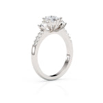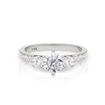 This exquisite three stone ring setting is designed to showcase a round brilliant-cut central stone, flanked by two perfectly balanced side diamonds. The setting is further adorned with eight smaller diamond accents along the shoulders, adding a touch of elegance and sparkle from every angle. Handmade in 9ct or 18ct white gold.