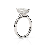 This exquisite cathedral-style ring showcases a stunning emerald cut diamond at its centre. The graceful arches of the cathedral setting elevate the diamond, allowing it to catch the light brilliantly. A delicate hidden halo of sparkling diamonds encircles the base of the centre stone, offering a subtle yet captivating detail. Handcrafted in 9ct or 18ct white gold.