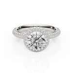 This stunning double halo micropavé diamond engagement ring features a round brilliant diamond central stone surrounded by a double halo of diamonds. Three rows of micropavé diamonds are set on the shoulders capturing and reflecting light from every angle. Handmade in 9ct or 18ct white gold.