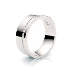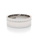 Stylish and sophisticated. The 8mm flat profile gives it a sleek and modern appearance. This ring has a single row of channel-set diamonds around the entire circumference of the band. This creates a continuous line of sparkle. Overall, this type of ring is a stunning and timeless choice that complements any style. Handmade in either 9ct or 18ct white gold.