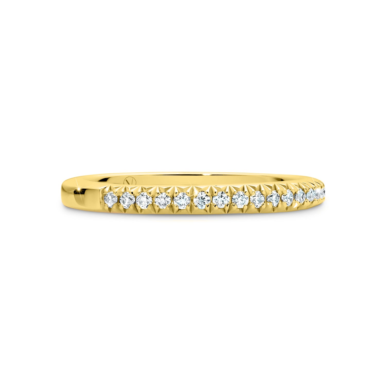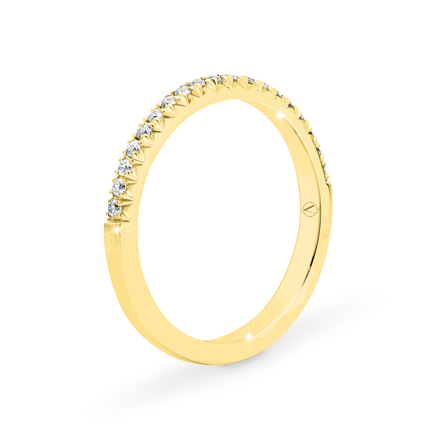 A precision-cut french pavé wedding ring set with 0.19ct tw. of round brilliant cut diamonds. A compliment too many engagement rings or perfect as an anniversary ring. Handmade in 9ct or 18ct yellow gold.
