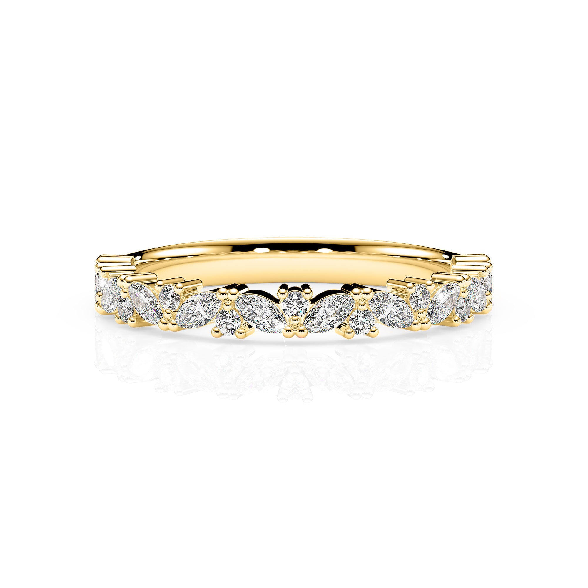 A stunning ring featuring 0.38ct tw. of alternating marquise and round diamonds that converge to form a mesmerising pattern across its stylish facade. A compliment too many engagement rings or perfect as an anniversary ring. Handmade in 9ct or 18ct yellow gold.