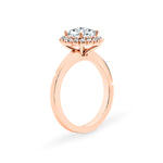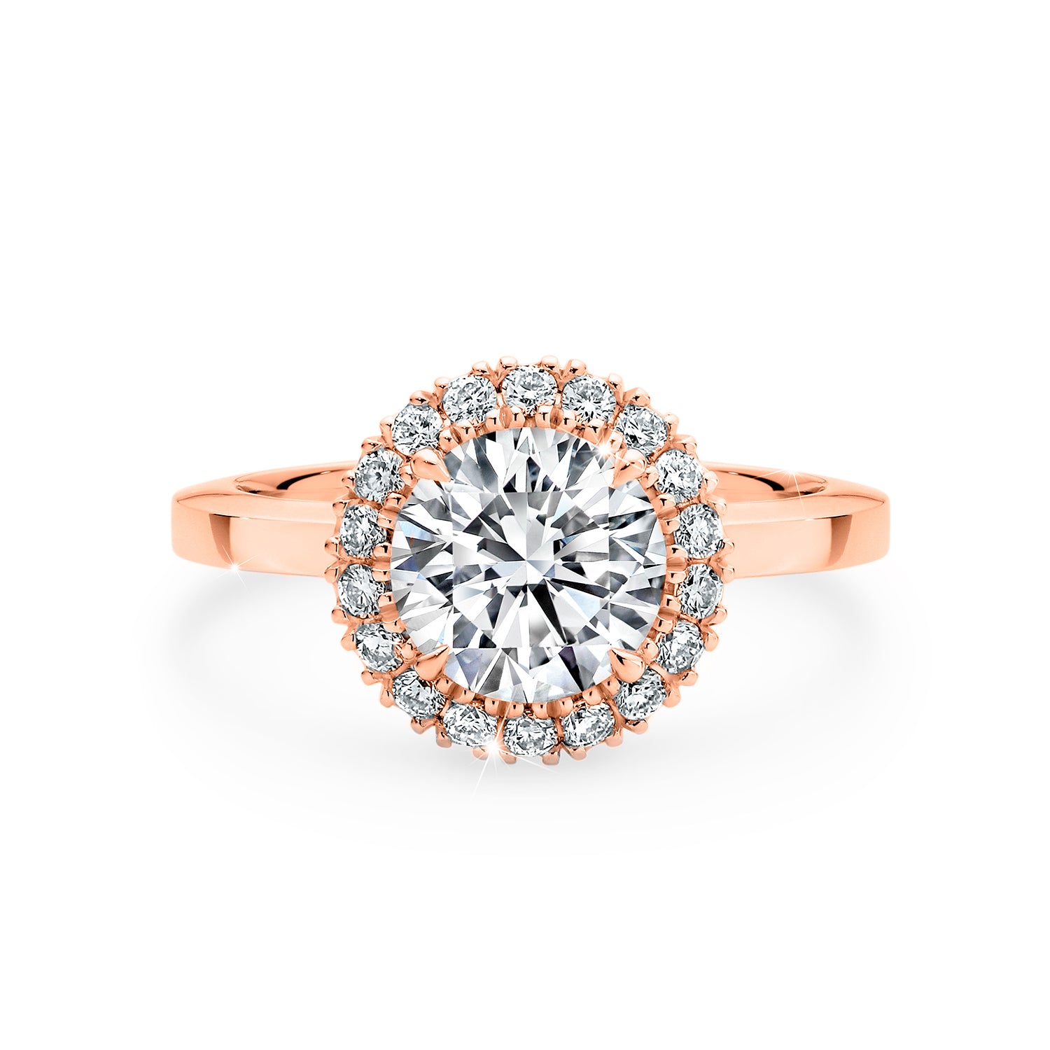 This is our rendition of a classically romantic setting. The brilliance of your centre stone is enhanced by a series of individually handset pavé diamonds. Carefully designed to sit at a perfect height on your finger and flush with your matching wedding ring, our signature finely sculpted wire basket flows seamlessly toward the underside of the halo, drawing in light so your diamond shines bright. Handmade in 9ct or 18ct rose gold.