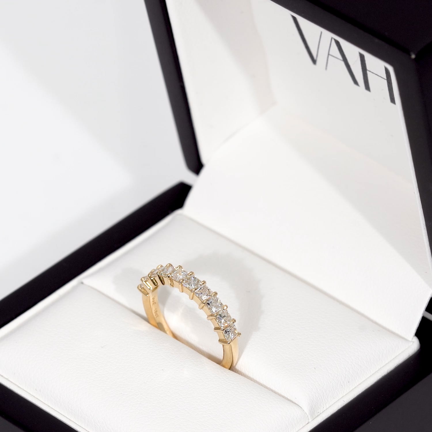Set with 10 princess-cut diamonds (available in lab-grown or natural), each precisely secured in pear-shaped claws. Handcrafted in 18ct yellow gold, the band features a fully rounded profile with a subtle taper for a clean, refined finish.