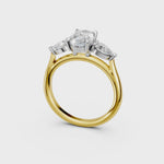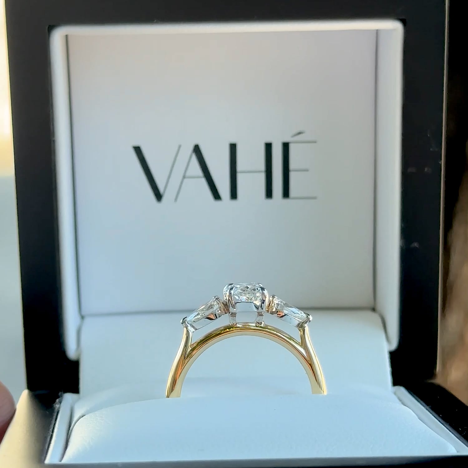 A refined three stone design built around an oval shape centre diamond, secured in a clean four-claw basket that allows plenty of light to enter from the sides. Flanking the centre are two pear-shaped diamonds (0.30ct each), angled to follow the flow of the band and add an elegant spread across the finger. The setting is designed to allow a wedding band to sit flush alongside it, with cathedral shoulders and an open gallery for a balanced, elevated finish. Handmade in 9ct or 18ct yellow and white gold.