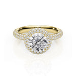 This stunning double halo micropavé diamond engagement ring features a round brilliant diamond central stone surrounded by a double halo of diamonds. Three rows of micropavé diamonds are set on the shoulders capturing and reflecting light from every angle. Handmade in 9ct or 18ct yellow gold.