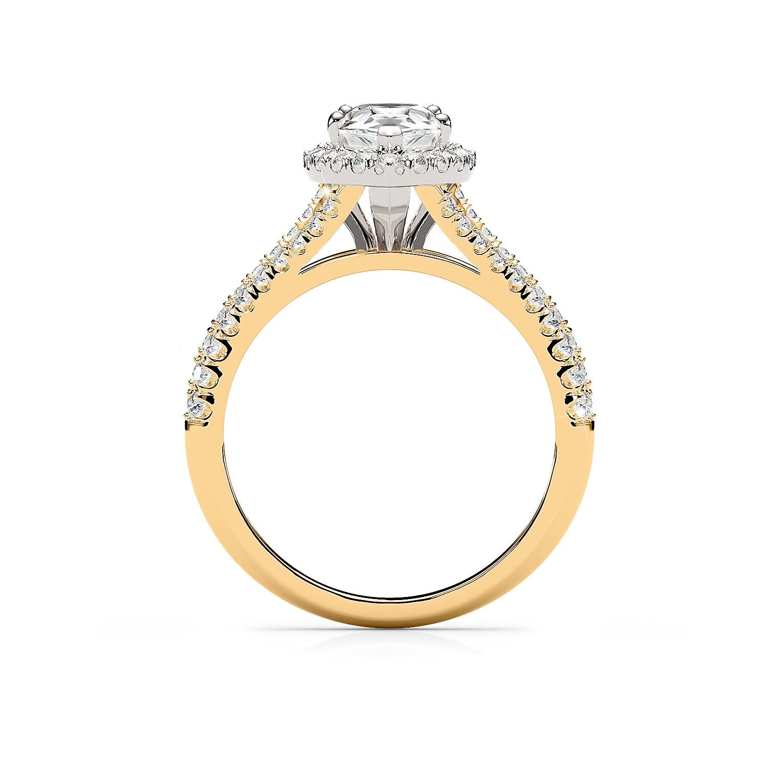 This setting is the perfect canvas for your chosen pear shaped diamond. Featuring a beautiful split band adorned with graduating white diamond accents and a captivating halo around the centre stone. Handmade in 9ct or 18ct yellow and gold.