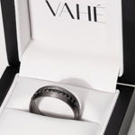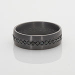 A newly acquired men's wedding band showcasing a solitary line of sleek black diamonds. Crafted from tantalum and finished with a brushed effect on each side.